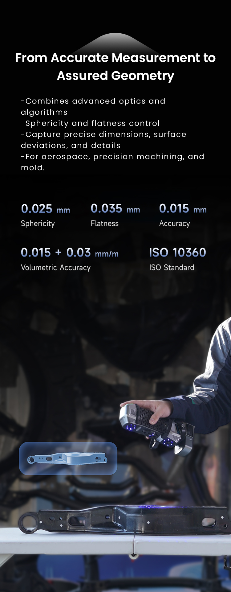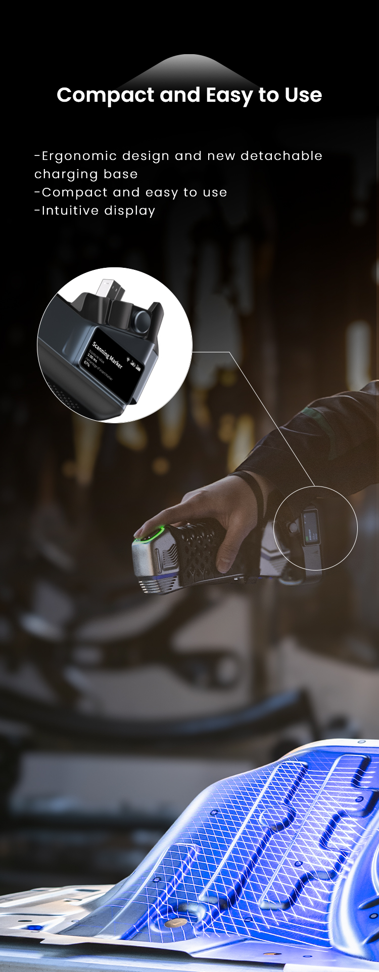 The NimbleTrack wireless 3D scanning system is highly compact and agile, which is designed to redefine the precise 3D measurements of small-to-medium-sized parts. Thanks to powerful on-board chips and built-in battery power supply, its 3D scanner and optical tracker are fully wireless, enabling true freedom.